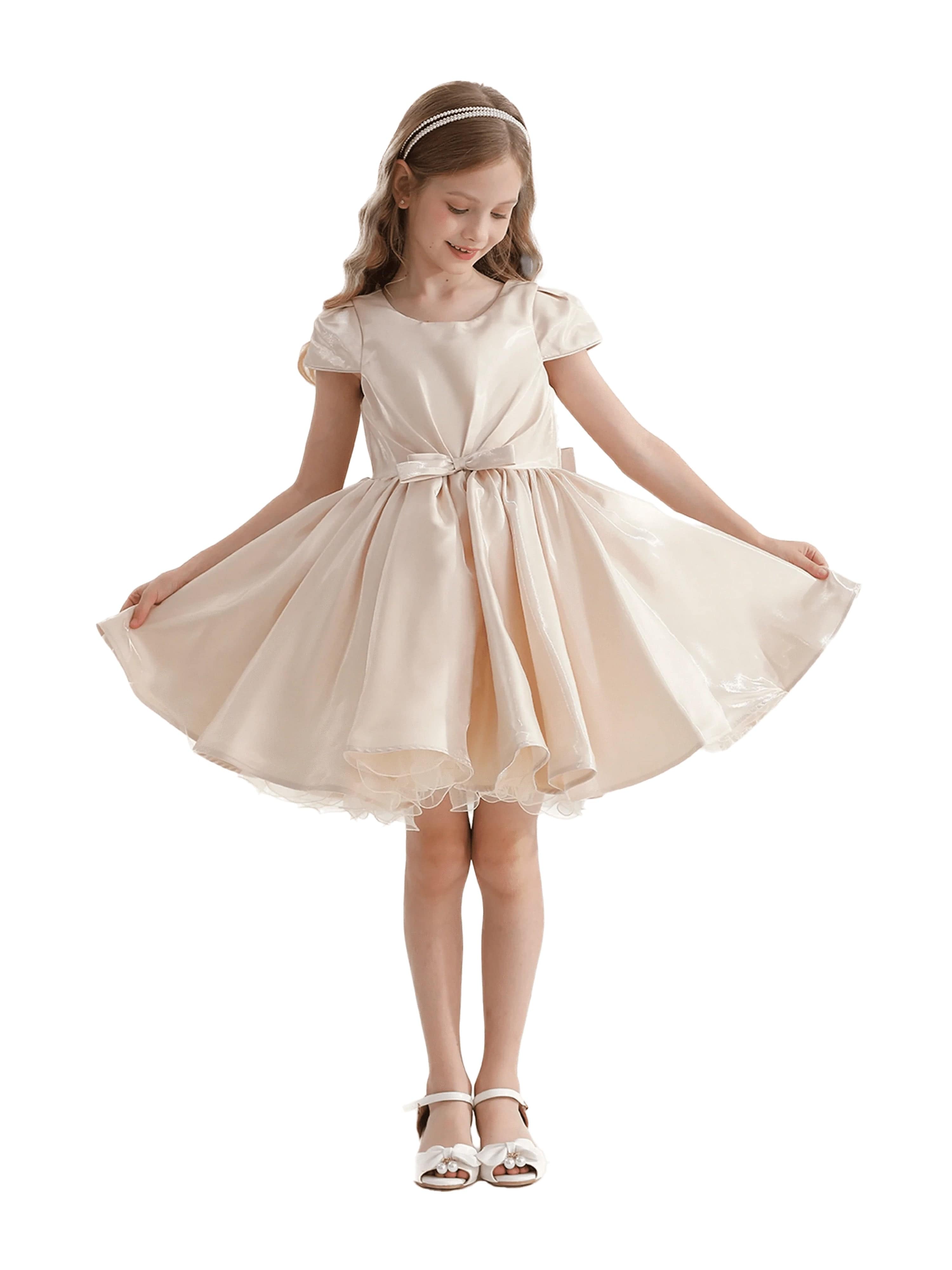Introducing the Champagne Bow Short Solera Dress by Tulleen, a stunning combination of elegance and youthful grace. With its radiant champagne satin hue, this short dress exudes warmth and sophistication, making it ideal for both special occasions and everyday celebrations.