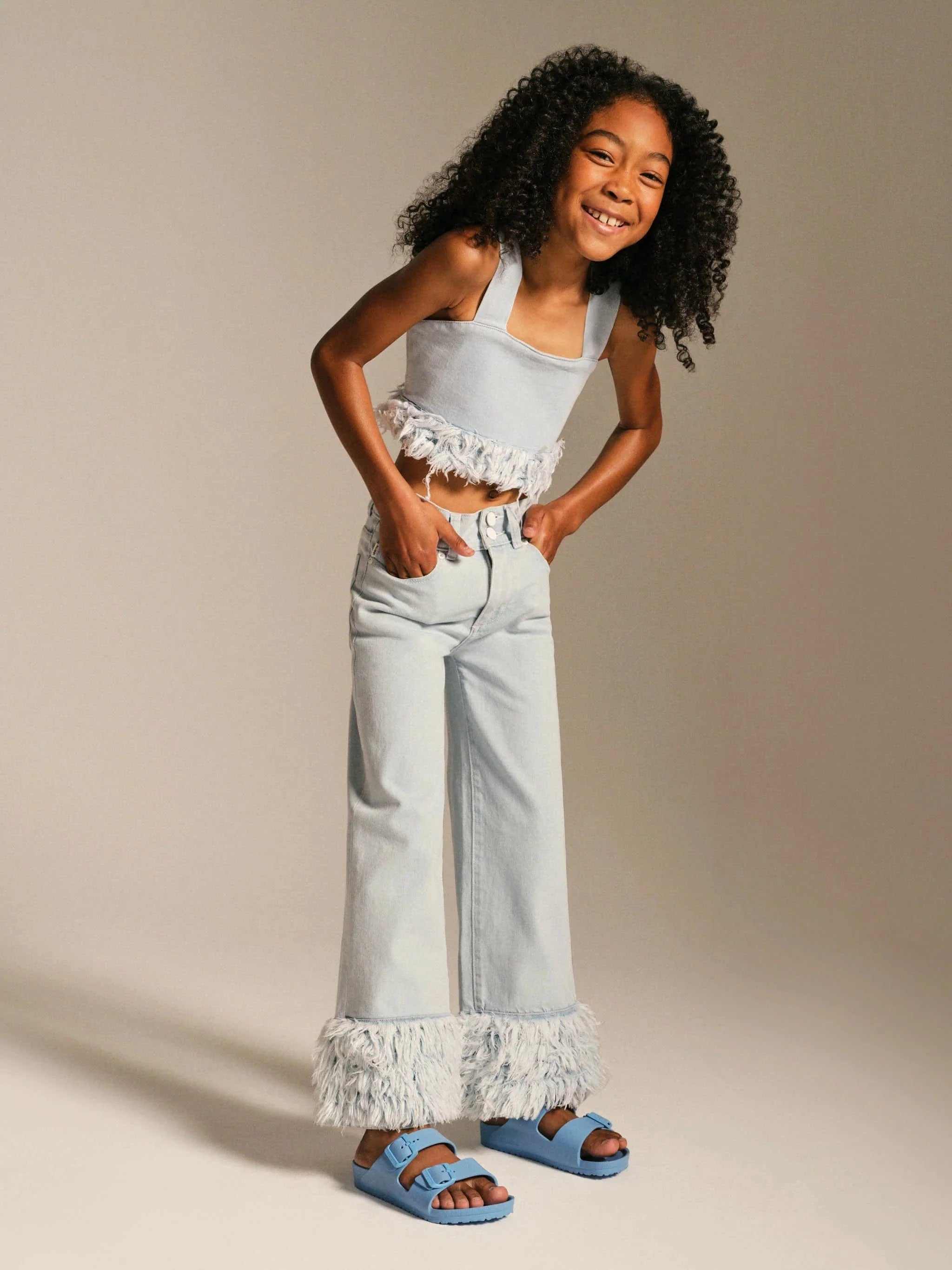Dress her in fashion-forward comfort with the Girls Cora Denim Fur Crop Top in Blue. Buy now!