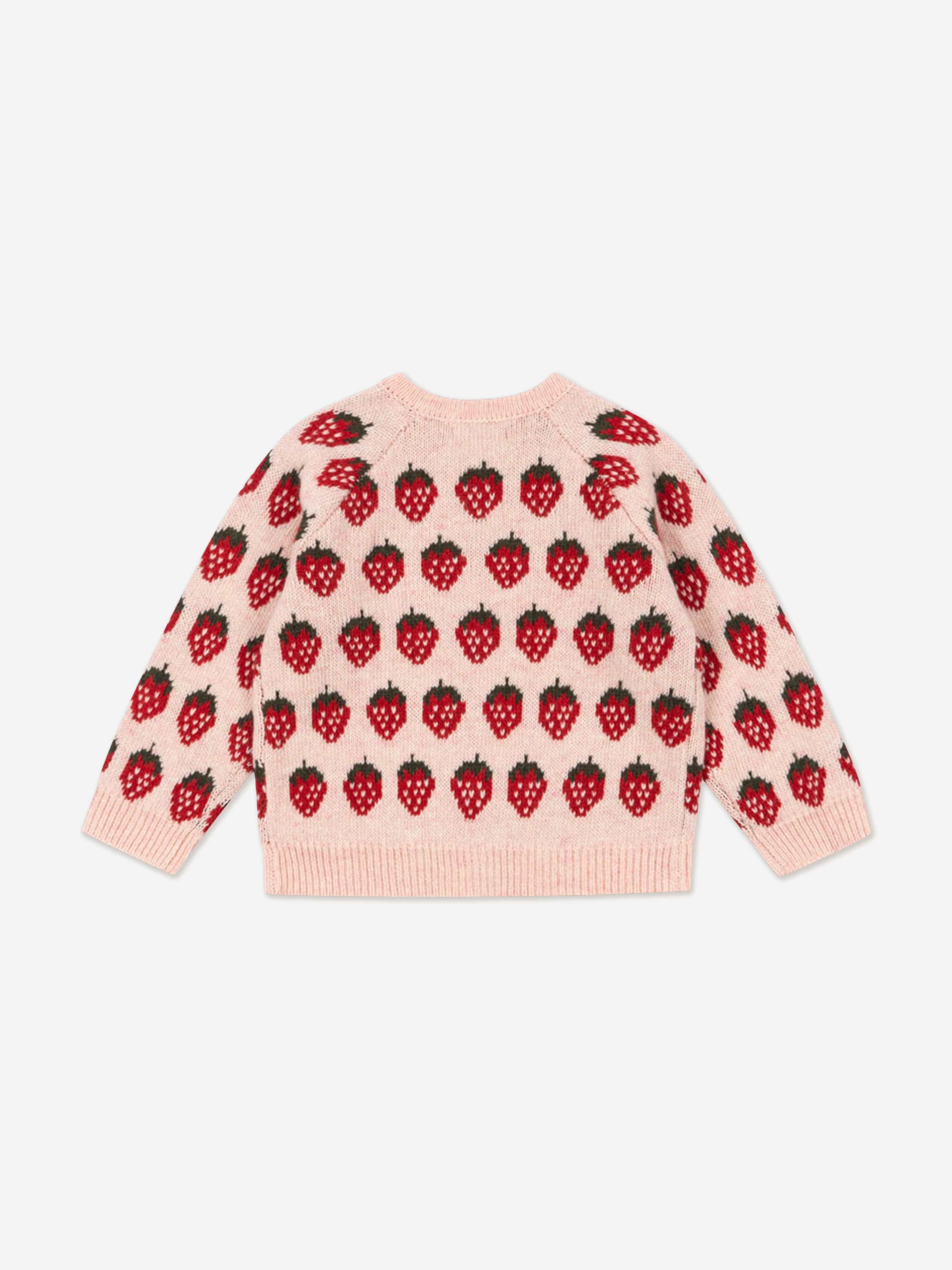 The Konges Slojd girls strawberry knit cardigan brings a sweet, whimsical touch to your little one’s wardrobe.