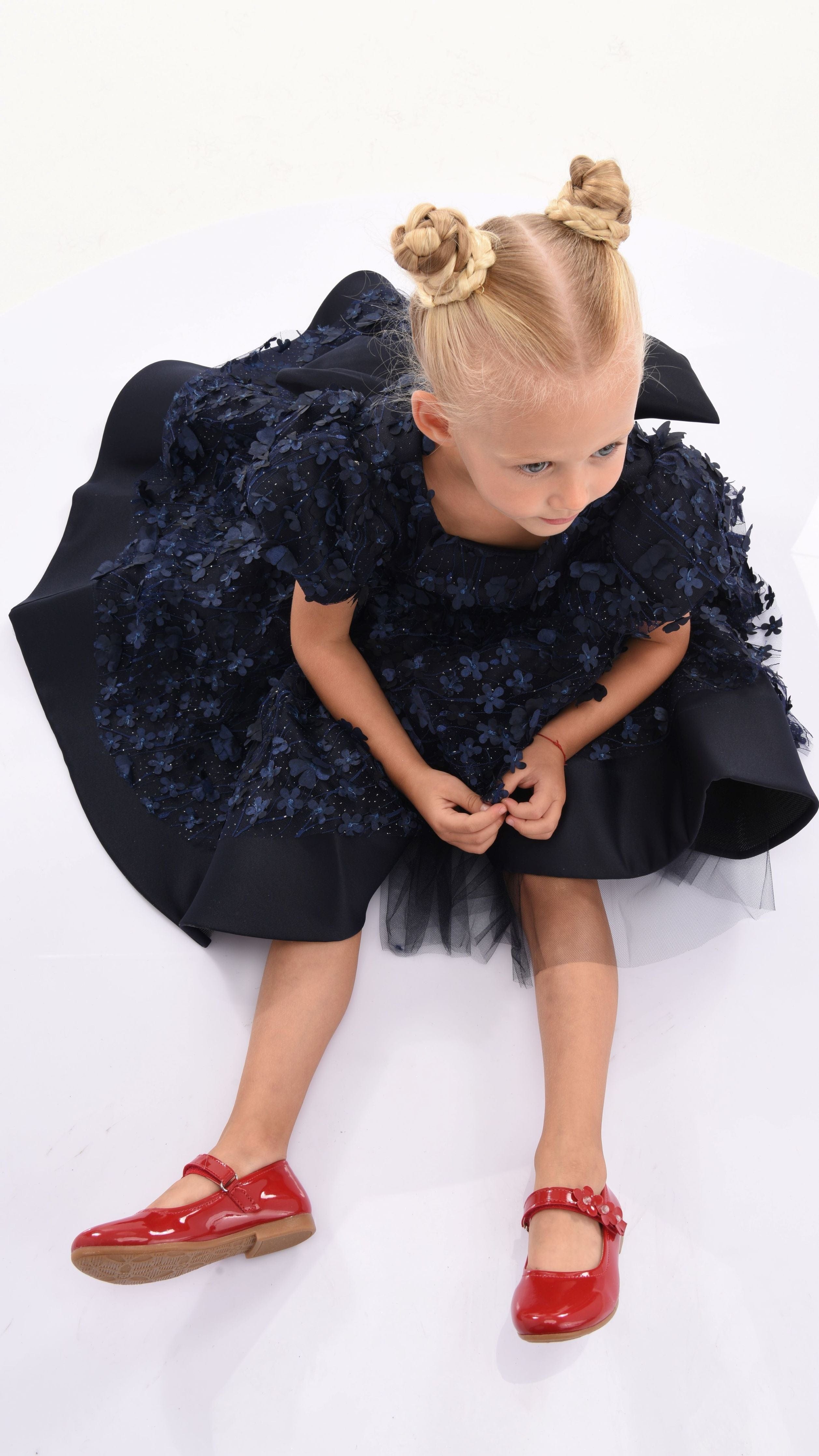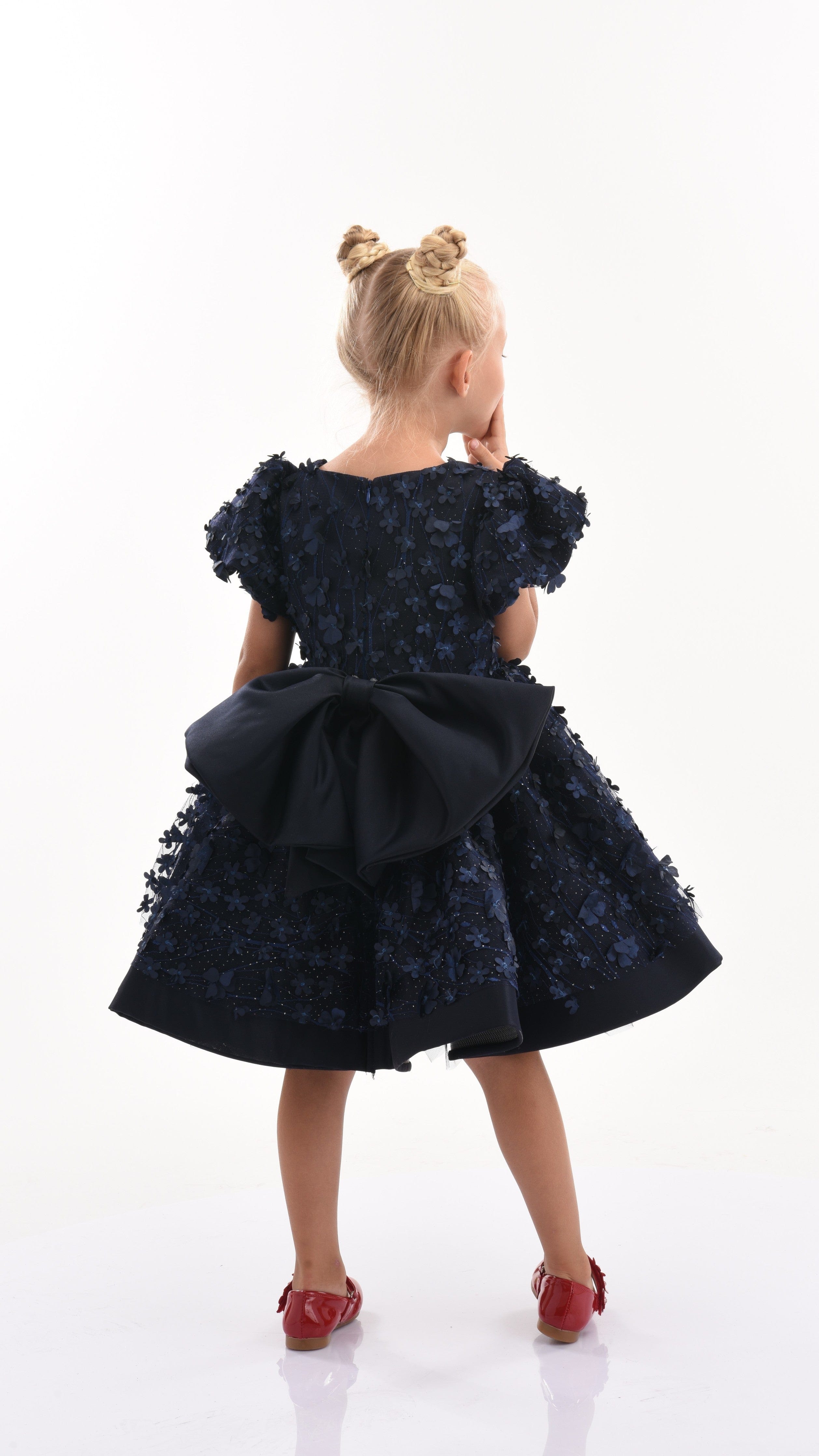 The Navy Moneta Floral Bow Dress for kid girls from Tulleen beautifully combines elegance and fun in a delightful and quaint design. This dress is perfect for any special occasion, from tea parties to family gatherings, ensuring your little girl feels as elegant as can be.