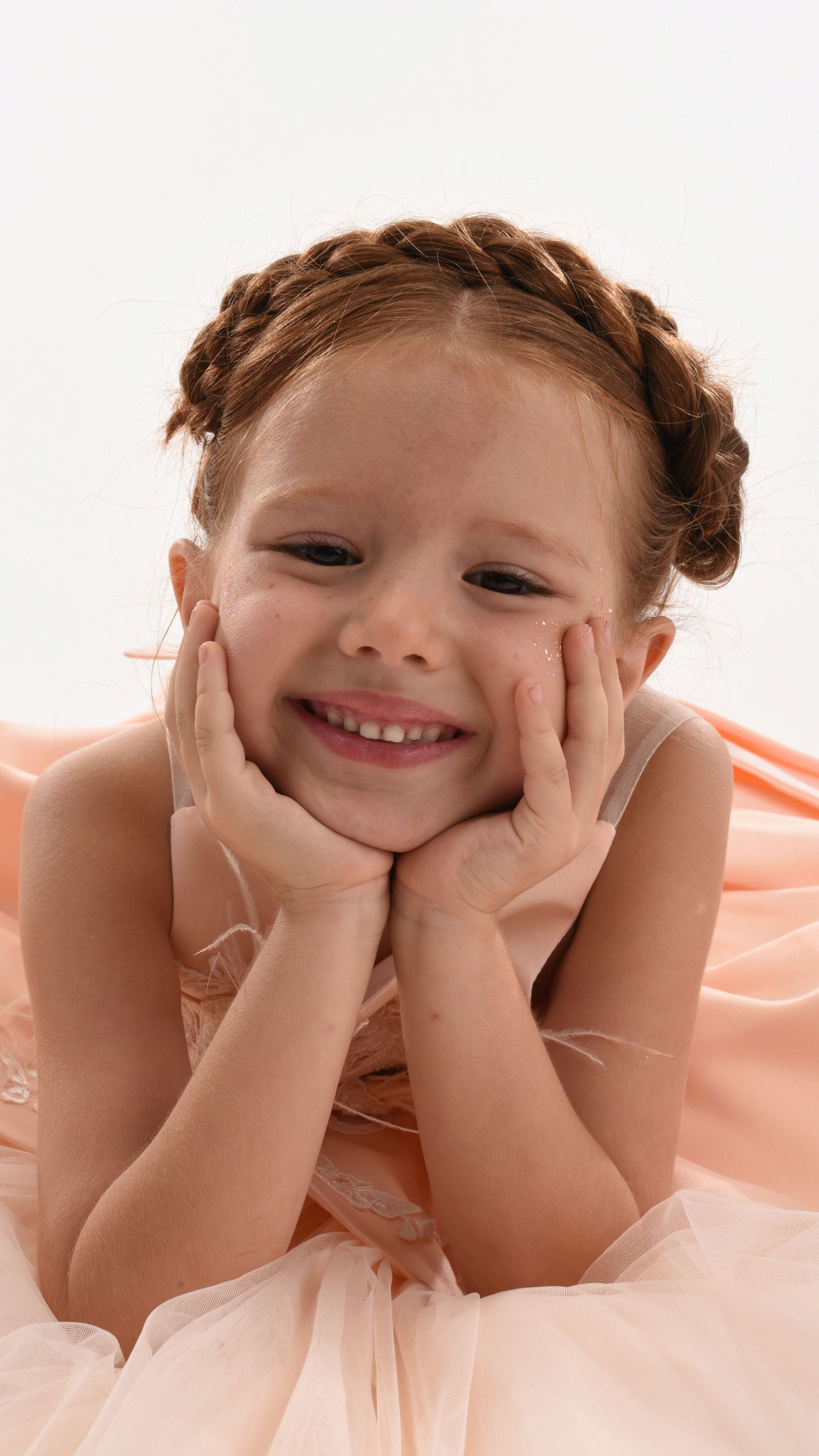 This peach a-line gown is unique in its hemlines and embellishments. The peach satin bodice is adorned with white flowers made of lace have sparse feathers for an added flair. The lace travels down to the skirt of the dress, which is overlayed with an asymmetrical pleated satin over peach tulle. An asymmetrical bow decorates the back of the dress, with a lace embellishment around the middle of the bow.