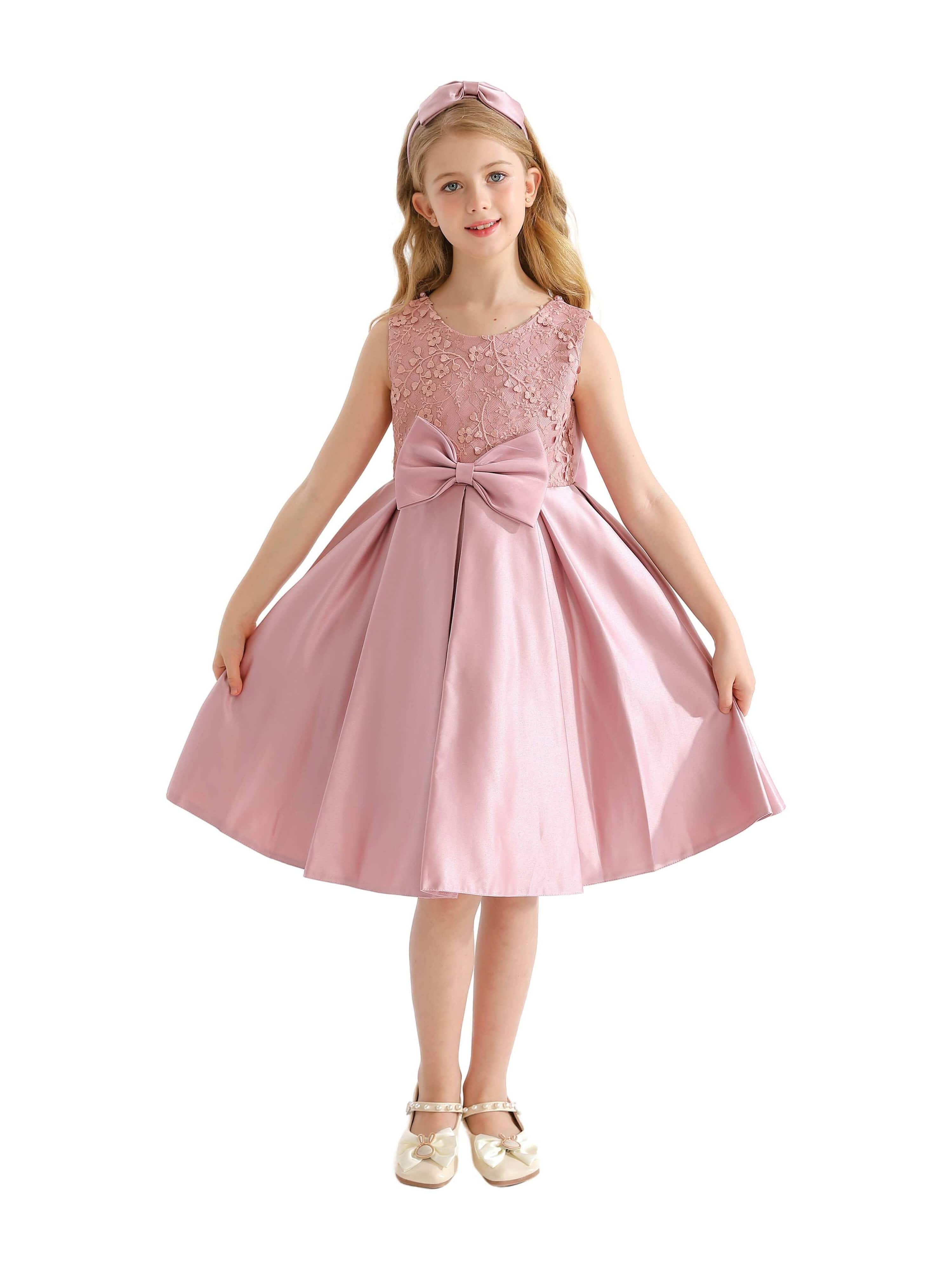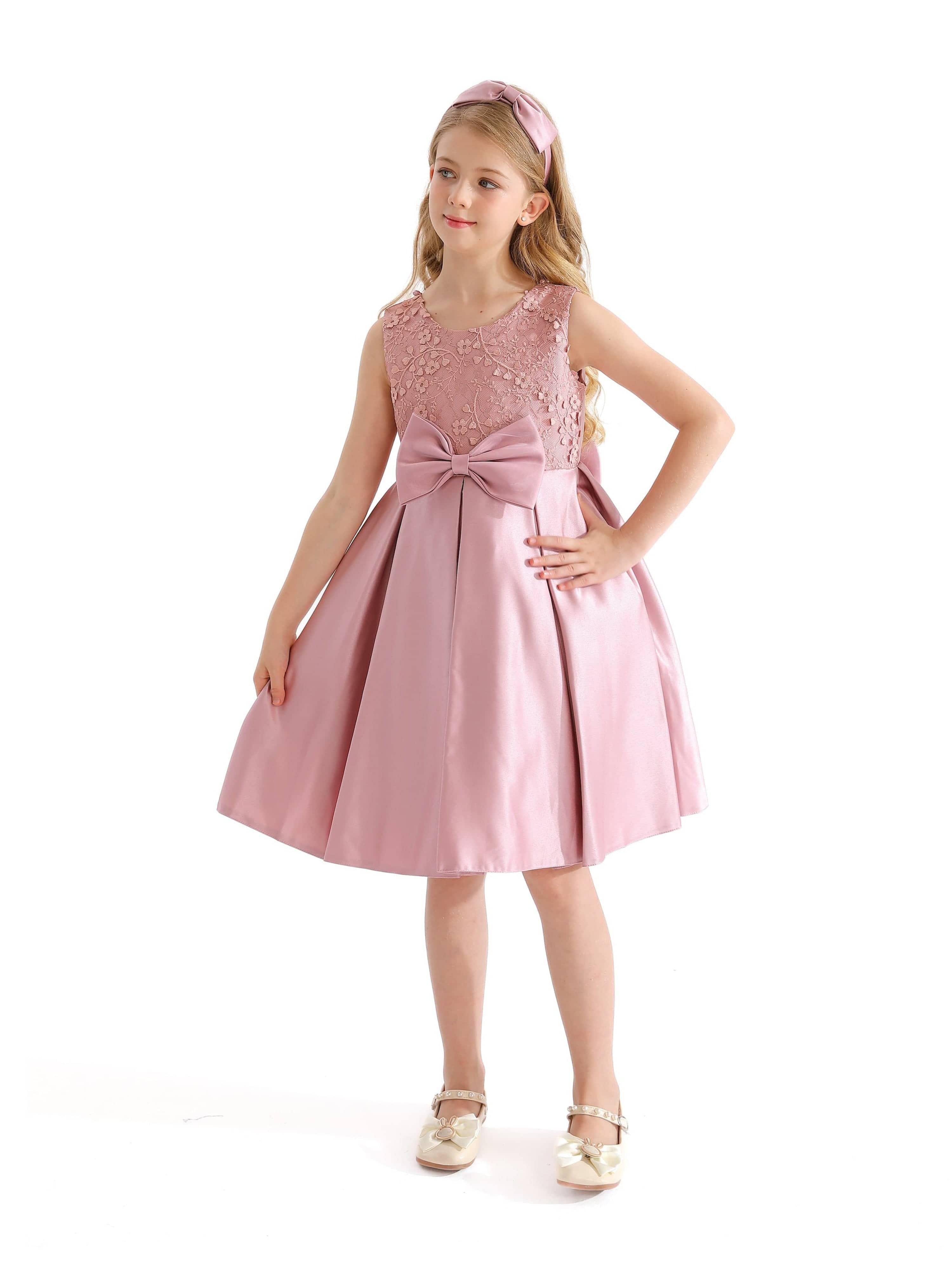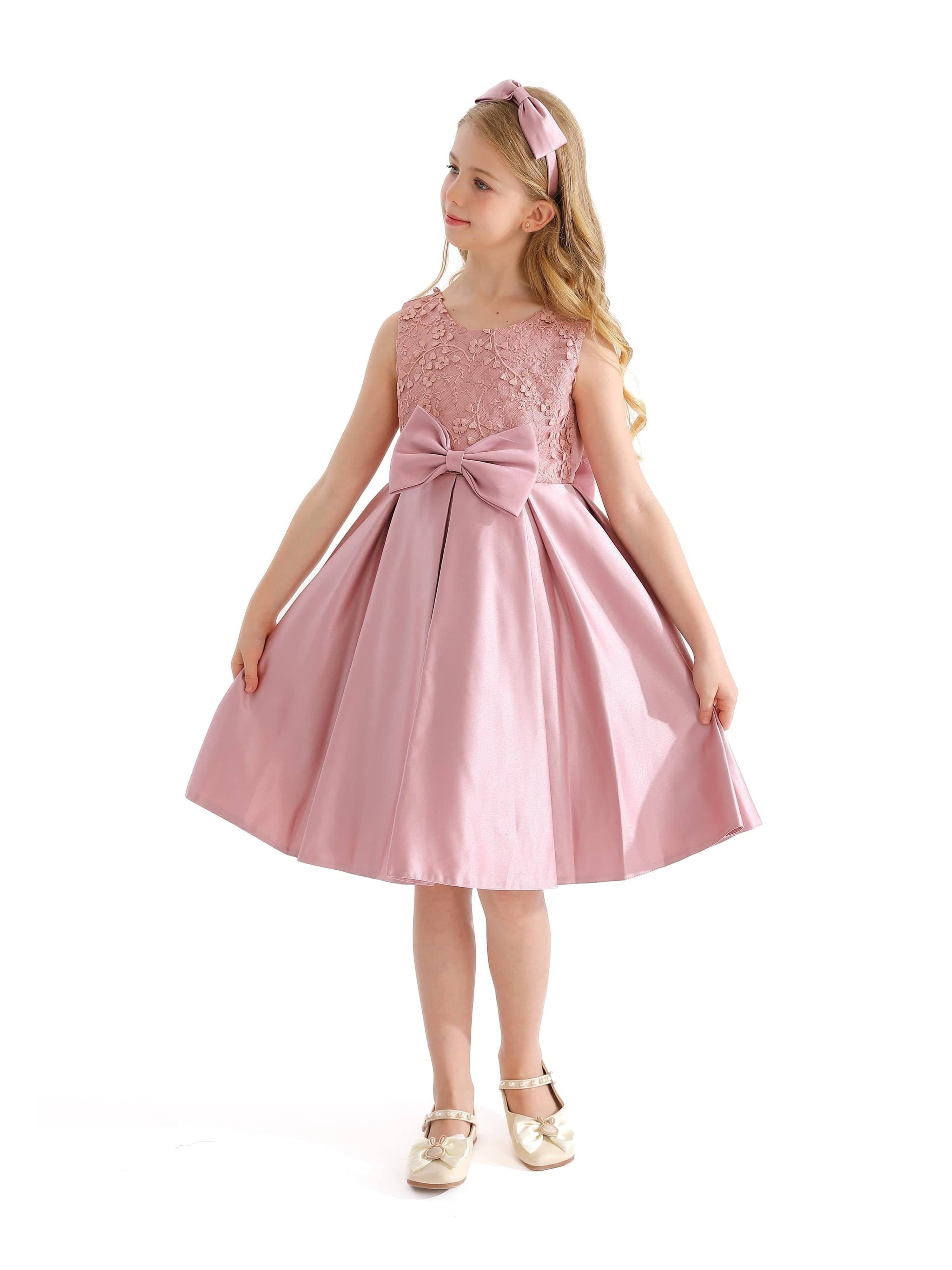 The Pink Hampton Sleeveless Double Bow Dress for kid girls from Tulleen is an elegant and charming choice for any special occasion. This dress features a sleeveless floral embroidered bodice, adding a touch of sophistication and delicate beauty. Firstly, the large bows in the front and back provide a striking and stylish accent that enhances the overall elegance of the dress.