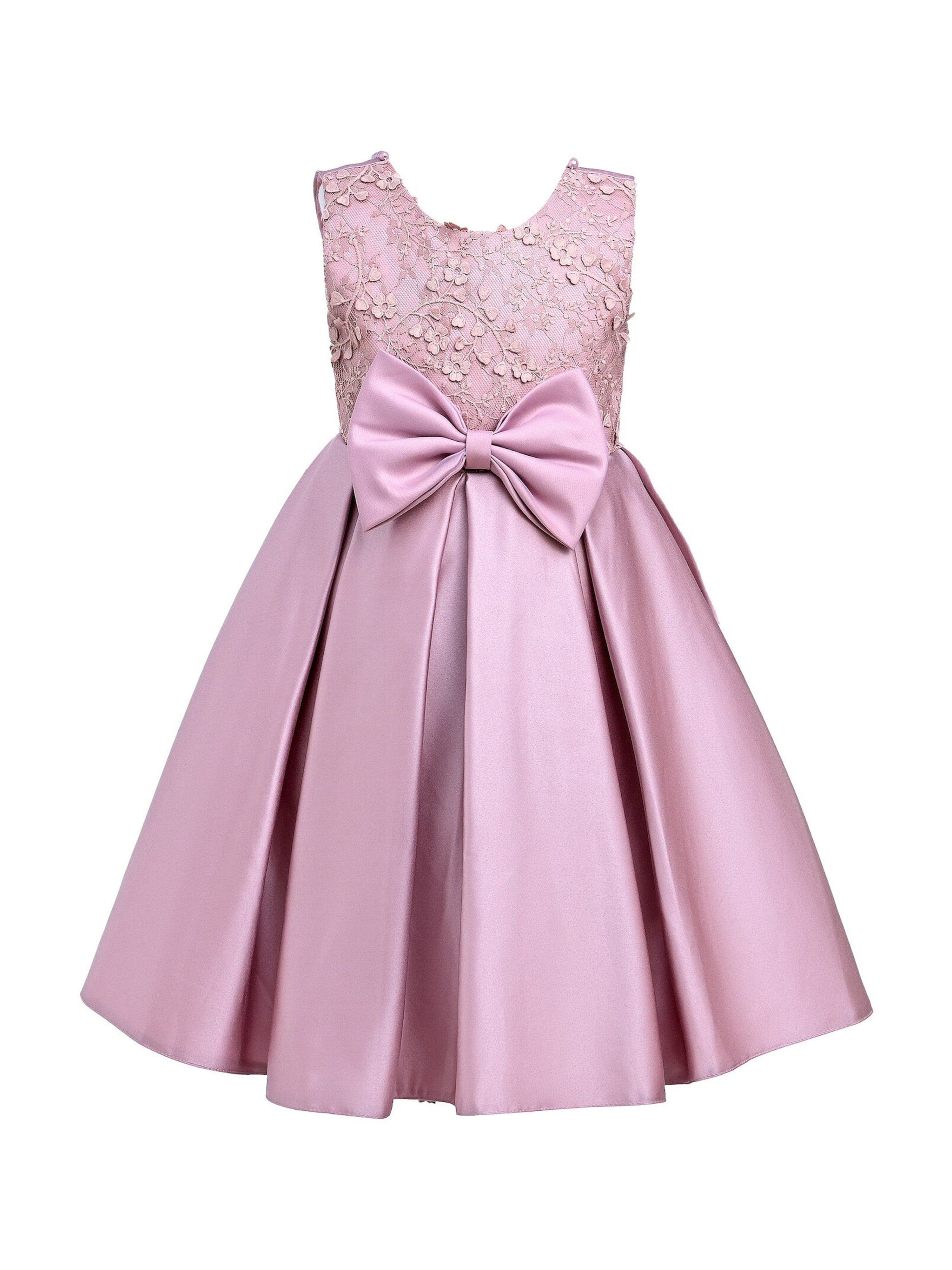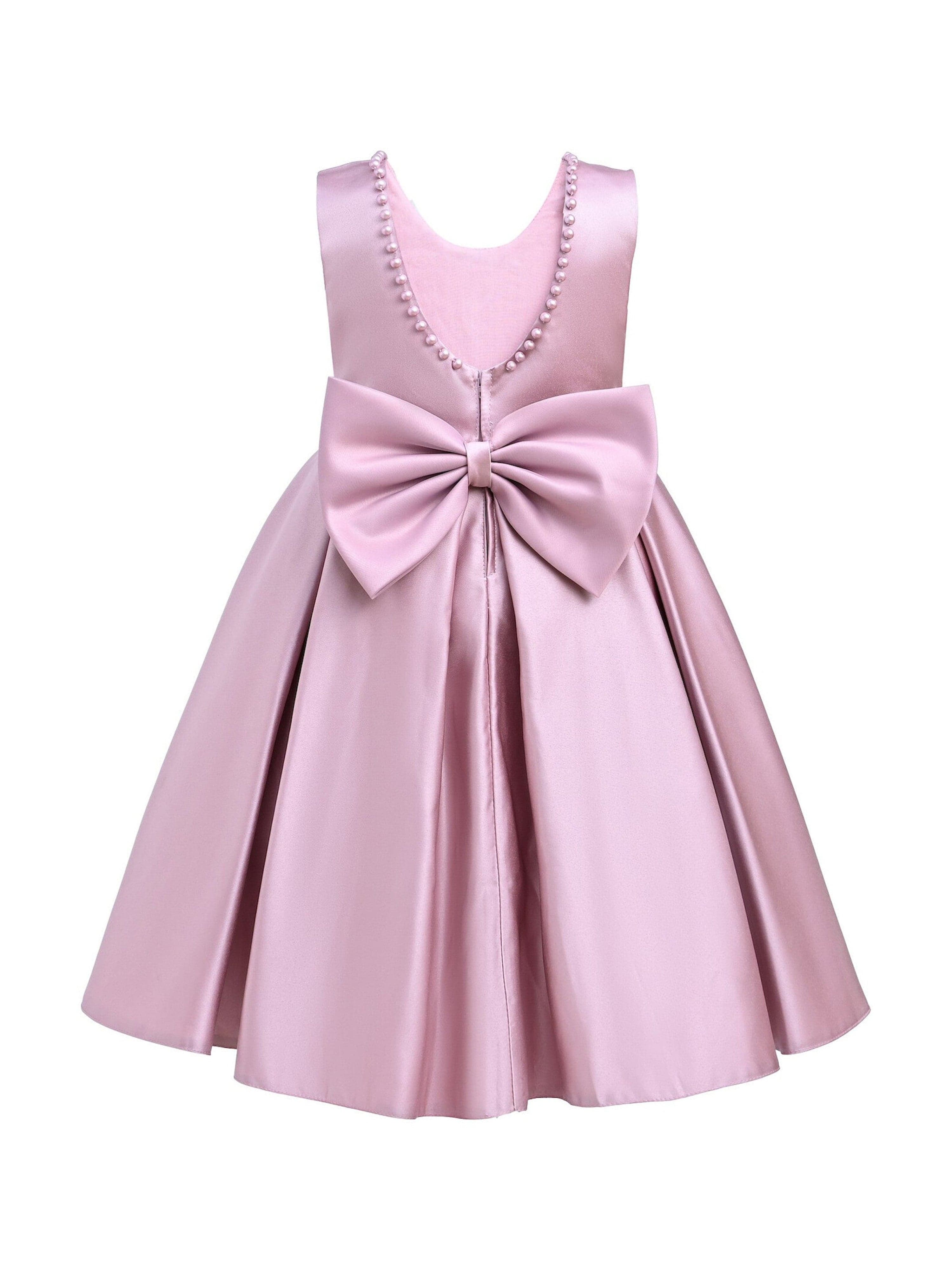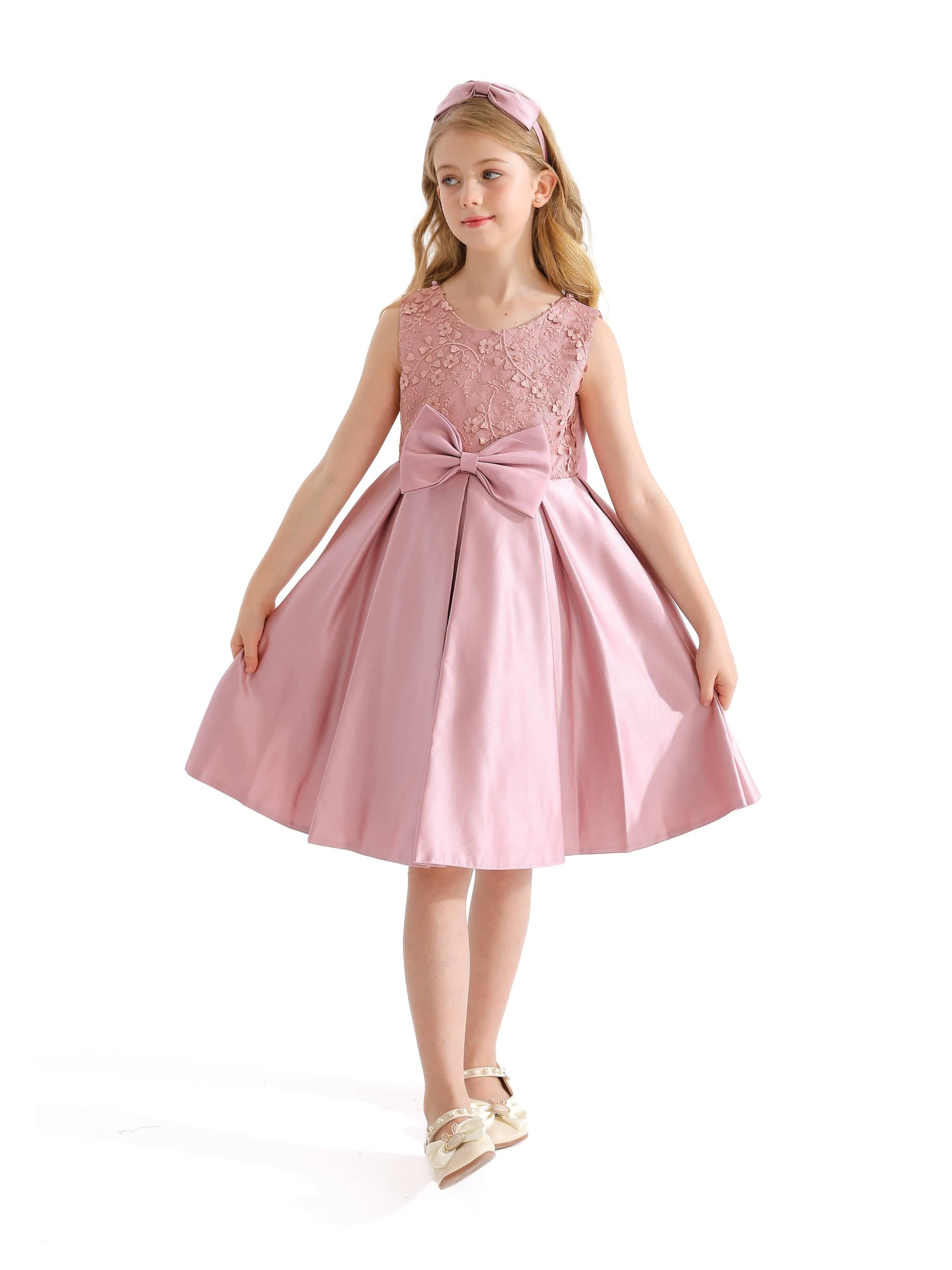 The Pink Hampton Sleeveless Double Bow Dress for kid girls from Tulleen is an elegant and charming choice for any special occasion. This dress features a sleeveless floral embroidered bodice, adding a touch of sophistication and delicate beauty. Firstly, the large bows in the front and back provide a striking and stylish accent that enhances the overall elegance of the dress.