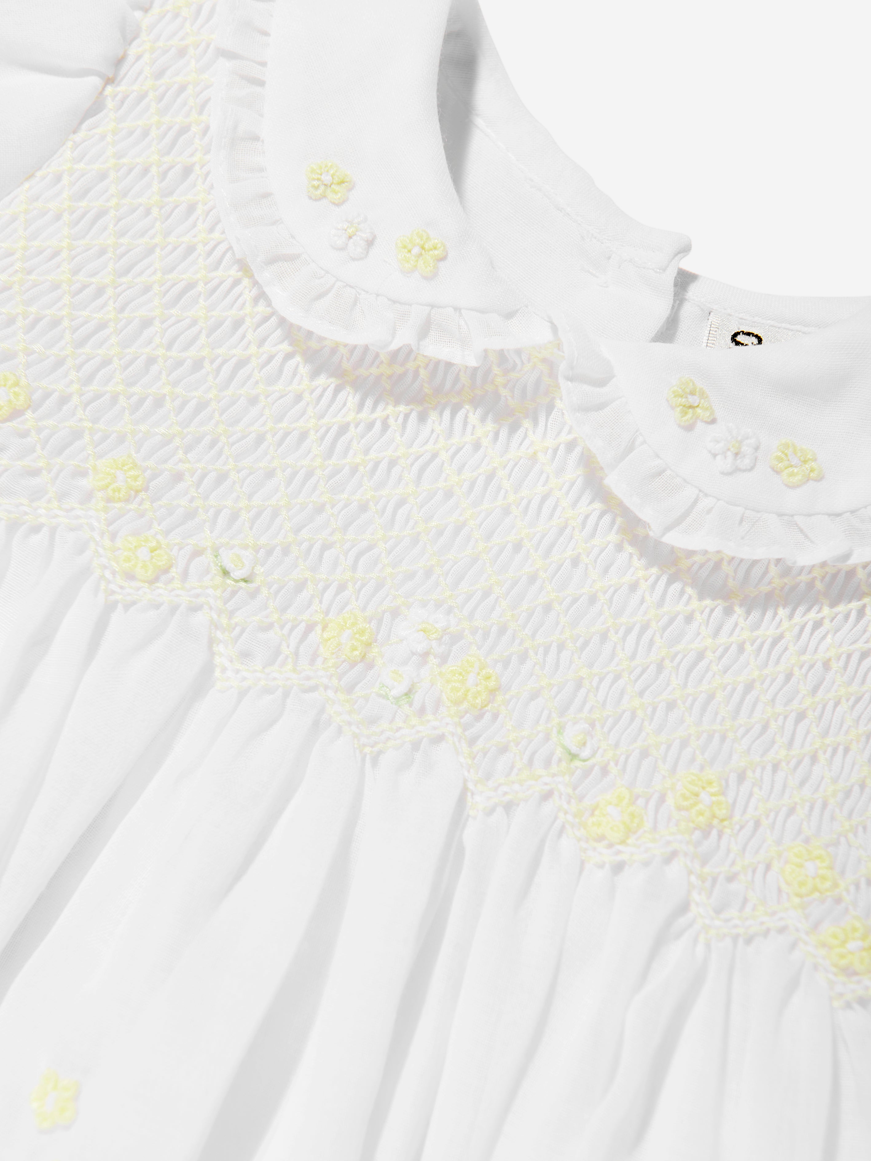 Sarah Louise embody a pristine bygone era in their traditional designs. This baby girls dress is reflective of the brand's intricate handmade needlework. Engineered in a white and lemon design with a smocked stitching on the bodice. It has a Peter Pan collar with ruffled detail, short puffy elasticated sleeves/trims, and is adorned with floral butterfly embroideries.