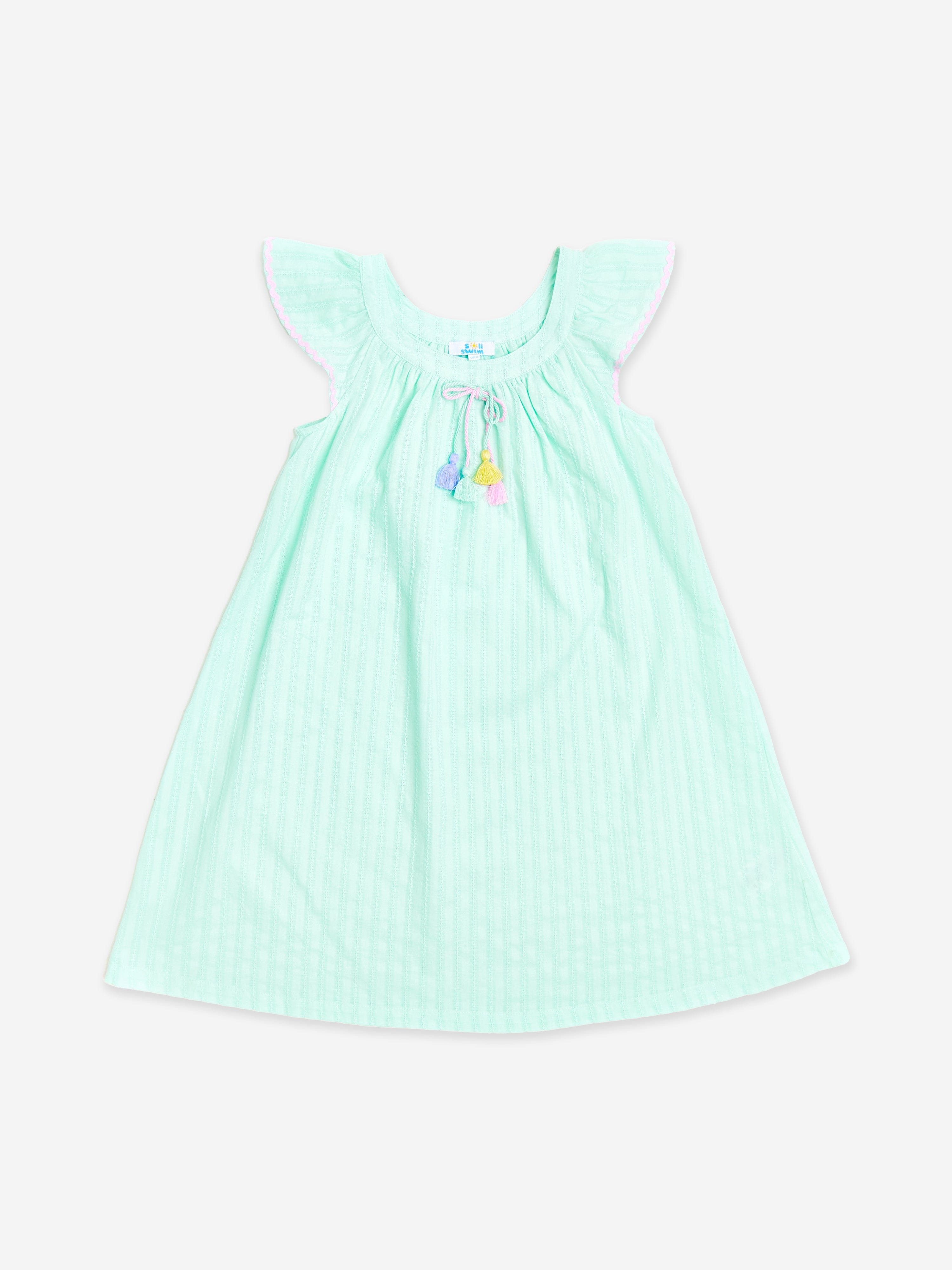 Soli Swim incorporate beautiful high qualities into their fun beachwear abstracts. This girls green dress is woven from lightweight and soft cotton. Features multicoloured tassel ties on the front and pink ric rac trims along the edges of the sleeves.