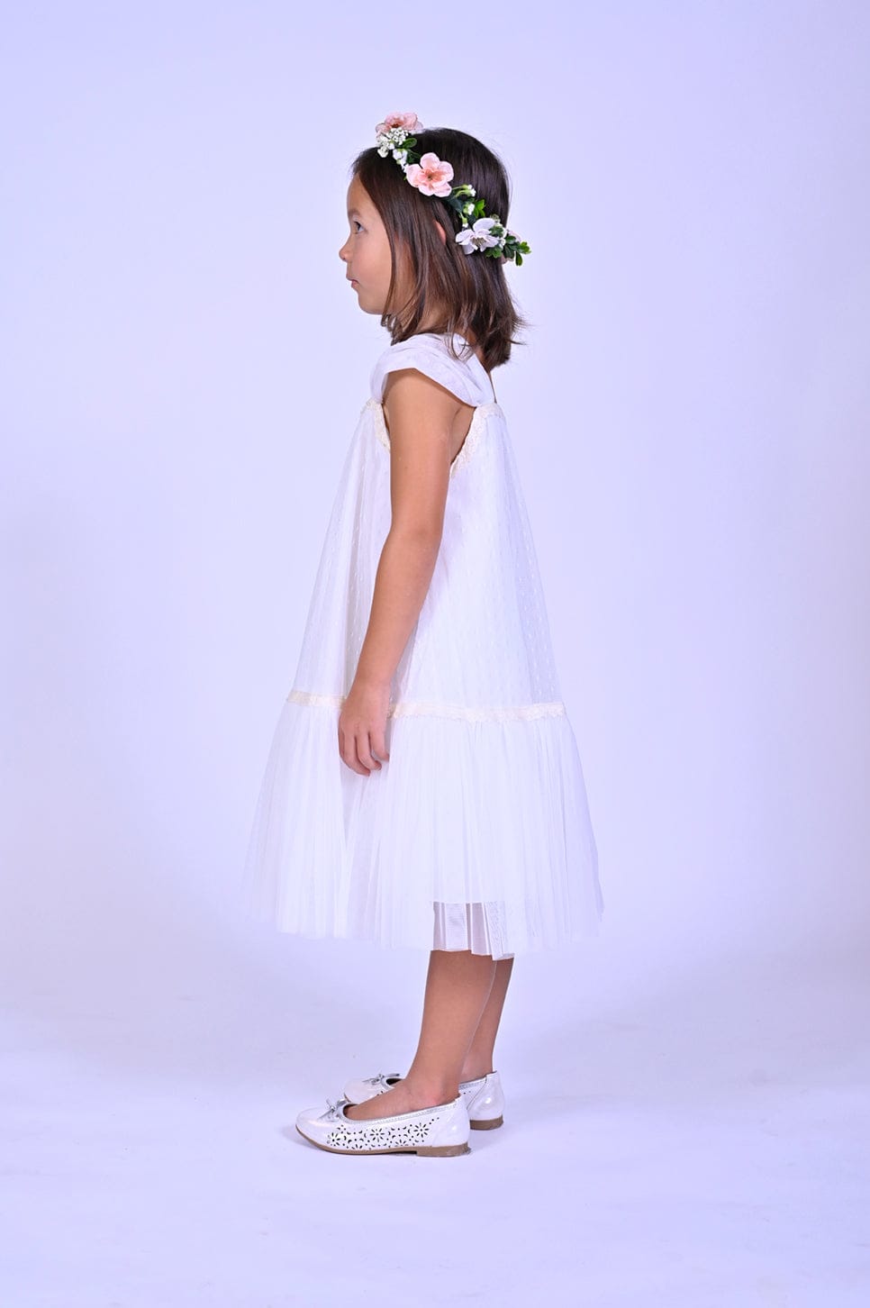 White square tulle overlay dress for kid girls from Tulleen. A playful square neck design with tulle sleeves. Embroidered design in beige at the neck and leading to a lightweight tulle skirt. Perfect for any fun and special occasion!